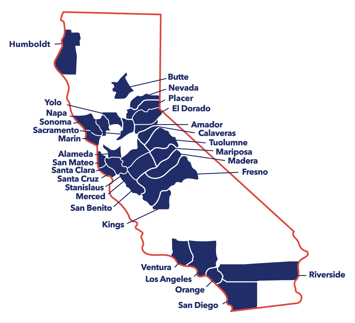 Participating VCA Counties: Alameda, Amador, Butte, Calaveras, El Dorado, Fresno, Humboldt, Kings, Los Angeles, Madera, Marin, Mariposa, Merced, Napa, Nevada, Orange, Placer, Riverside, Sacramento, San Benito, San Diego, San Mateo, Santa Clara, Santa Cruz, Sonoma, Stanislaus, Tuolumne, Ventura, Yolo.